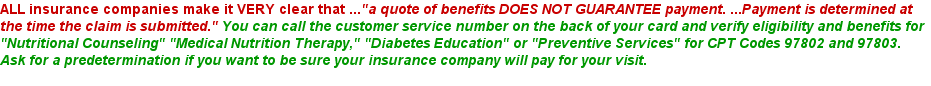 PLEASE Check with your insurance company or human resource department if you aren't sure if nutrition counseling is covered.
